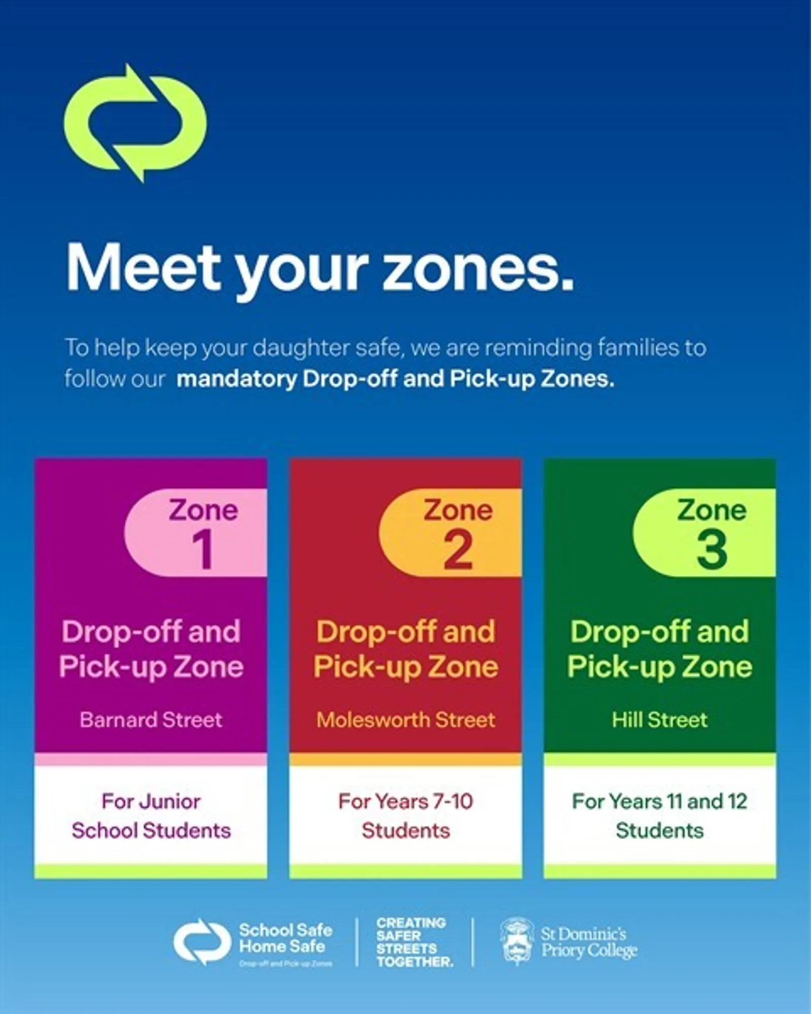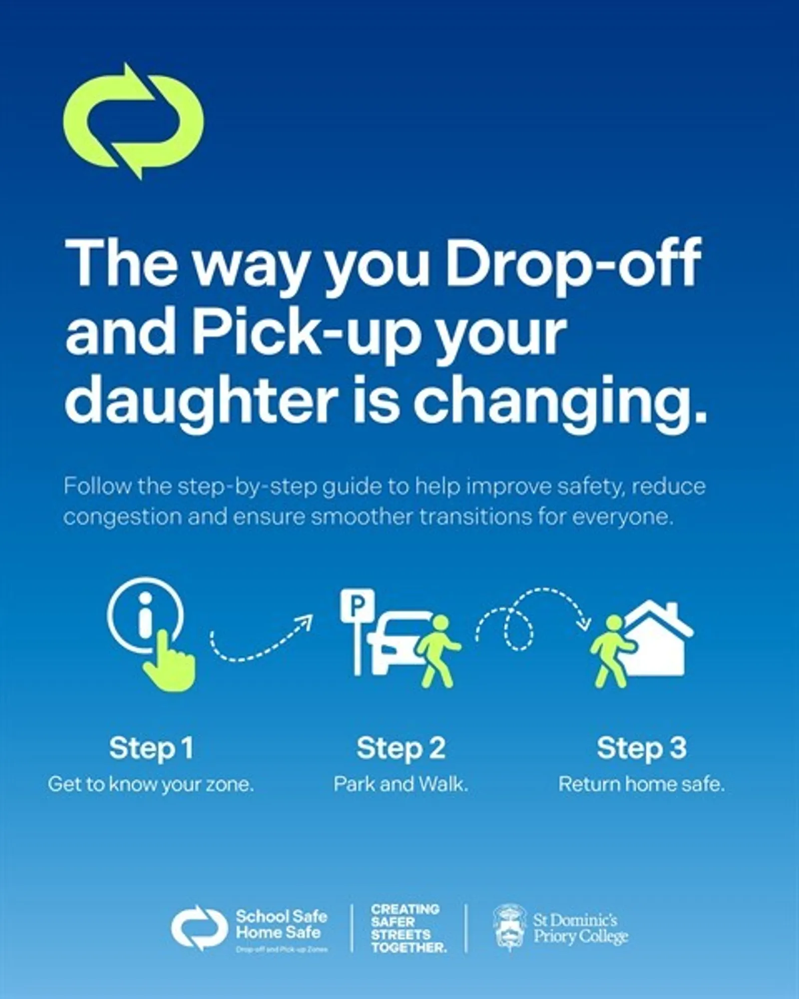 Our intention is to improve safety for students at the beginning and end of the school day and will involve some changes to collection procedures. More detailed information has been sent home with your daughters, and is published on the College website.